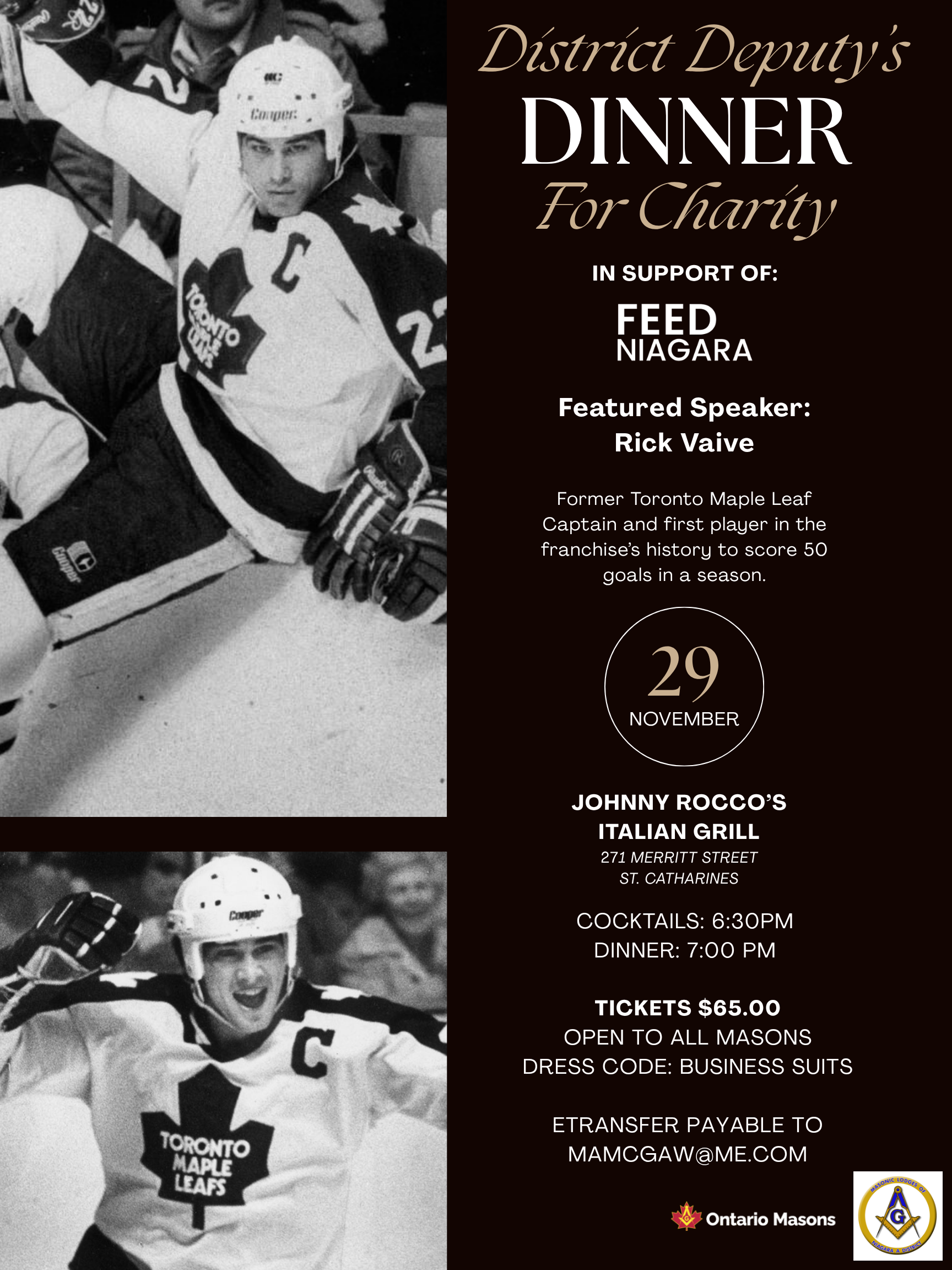 ![]() Join the DDGM for dinner with former Toronto Maple Leaf Captain, Rick Vaive in support of Feed Niagara. Niagara A District is proud to welcome a true Canadian hockey legend — Rick Vaive. Born in Ottawa and raised in Prince Edward Island, Rick made his mark early in the game, and in 1981 became the […] |